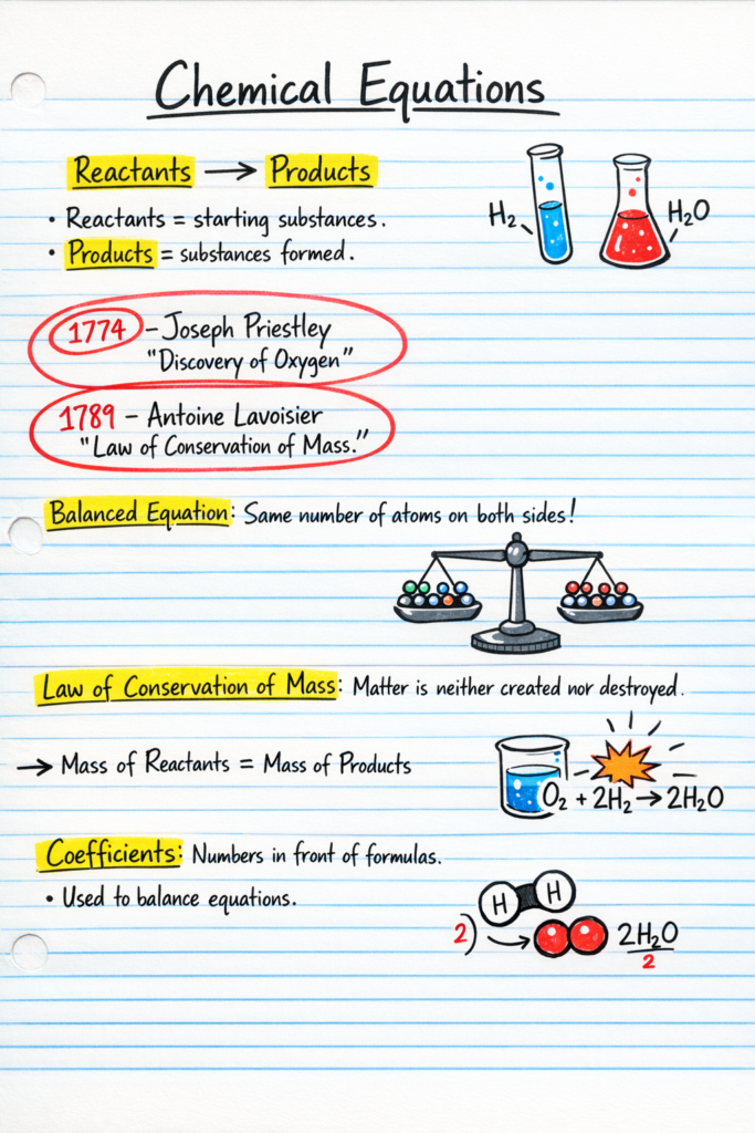 This follows the Law of Conservation of Mass (1789 – Lavoisier), which states that matter is neither created nor destroyed in a chemical reaction.
